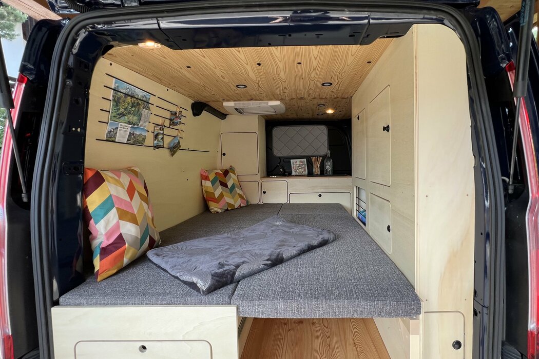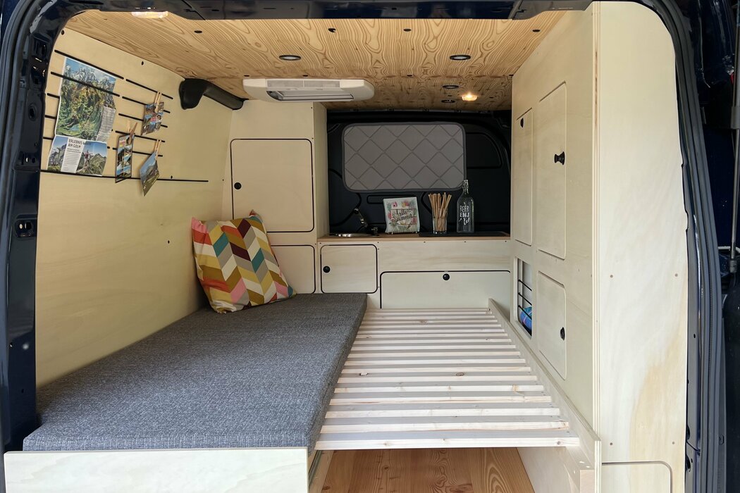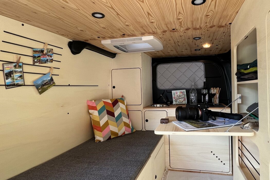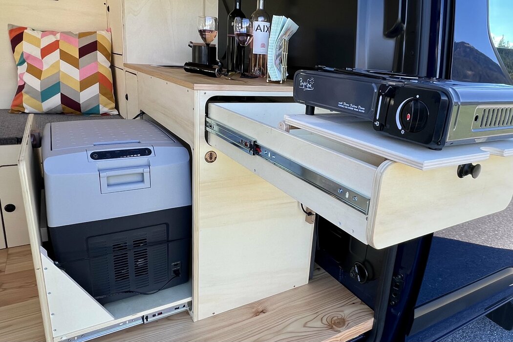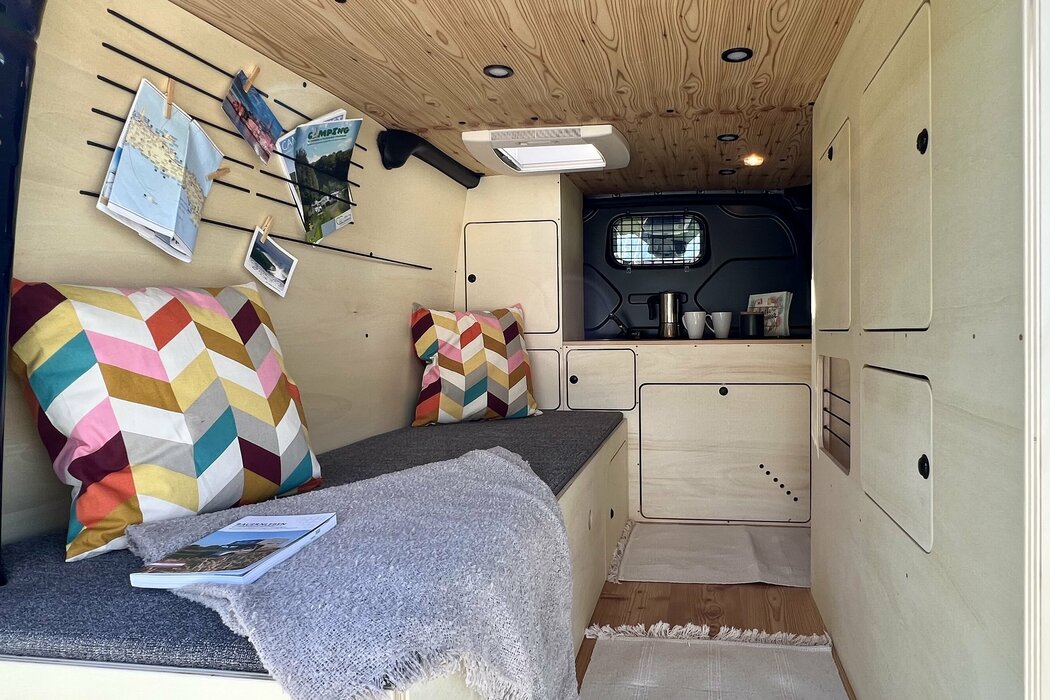 Die von Tischlerarbeit speziell ausgebauten Campingbusse sind im Innenraum mit Pappelsperrholz und Eichenholz ausgestattet.